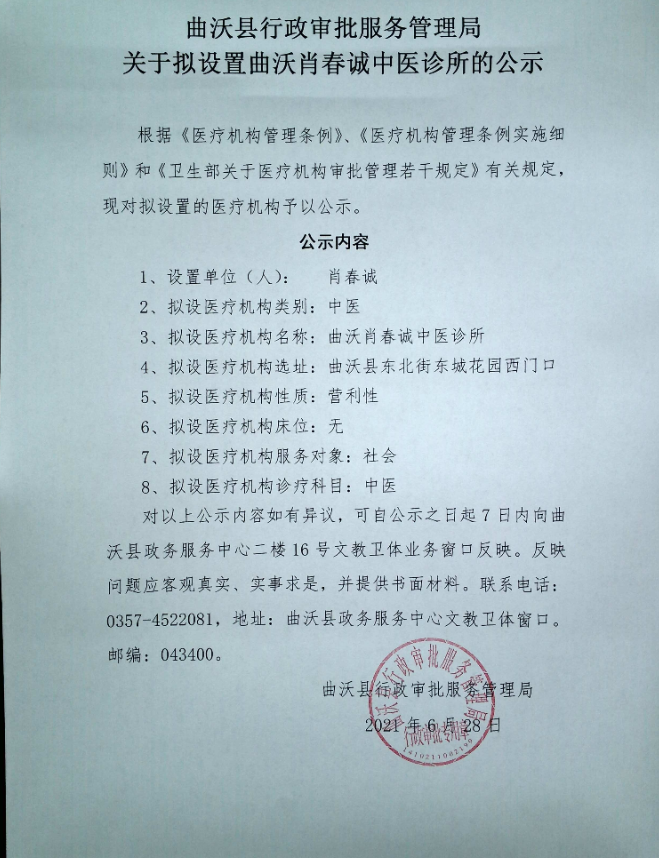 曲沃縣行政審批服務管理局 關于擬設置曲沃肖春誠中醫(yī)診所的公示