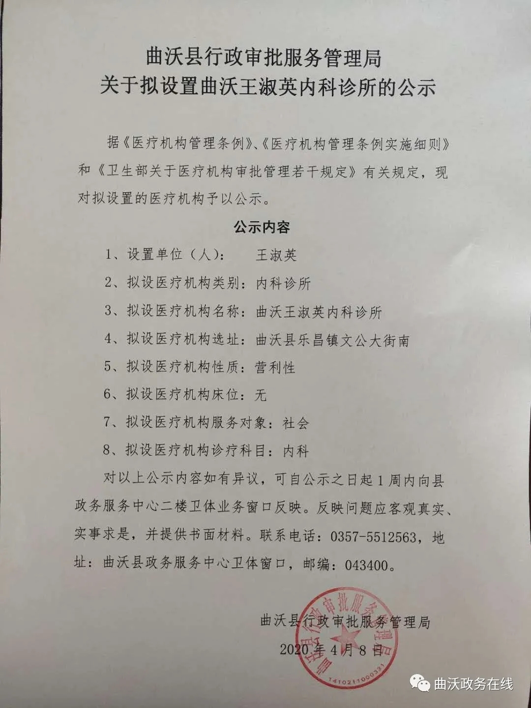 關(guān)于擬設(shè)置曲沃王淑英內(nèi)科診所的公示