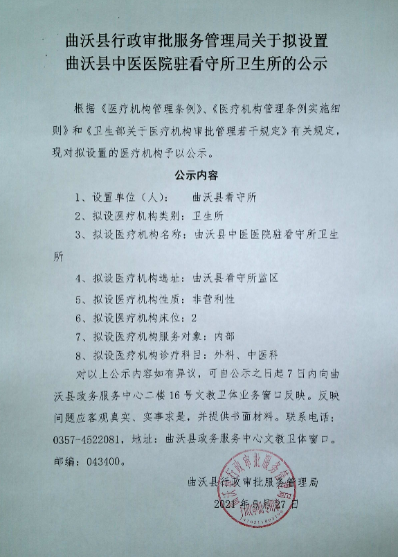 曲沃縣行政審批服務(wù)管理局關(guān)于擬設(shè)置曲沃縣中醫(yī)醫(yī)院駐看守所衛(wèi)生所的公示
