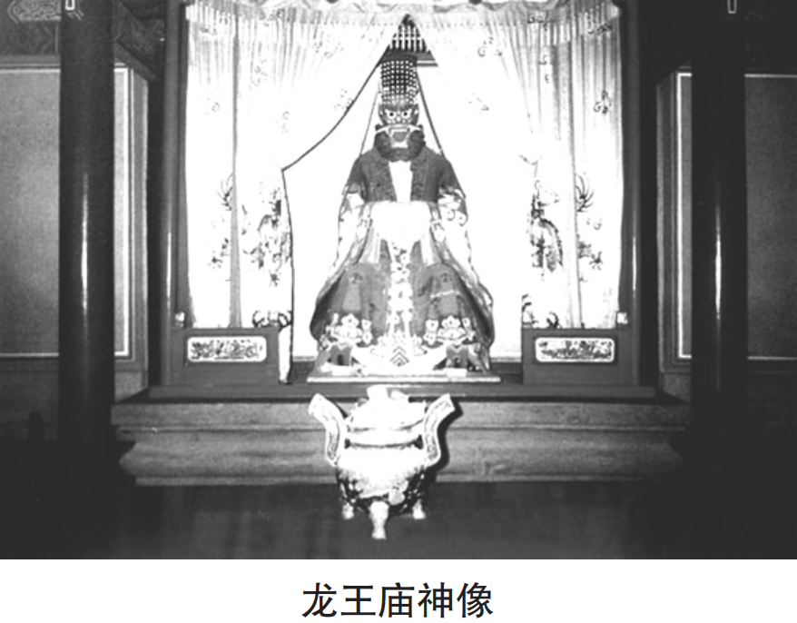 數(shù)日功夫,龍王廟建成了,它坐北向南,依山傍水,規(guī)模宏大,氣勢磅礴,廟中最北邊有正殿五間,前有獻殿三間,中有過廳五間,南有戲臺一座,戲臺兩邊建有東西兩個廟門,廟院中東西兩側(cè)還建走廊各十余間。龍王廟的正殿中有龍王爺塑像一座,中間兩根直通屋頂?shù)哪局嫌袃杀P木龍。建廟時,人們沒有忘記退去洪水的青龍兄弟,便把它倆的像雕成木龍,纏繞在這兩根木柱上,同龍王爺一起享受人們的祭祀。大殿東西兩側(cè)還塑有雷、電、火、雨、風(fēng)、云、霧、雪八大金剛。塑像都有一人多高,身涂五彩,飄衣飛帶,威風(fēng)凜凜。
