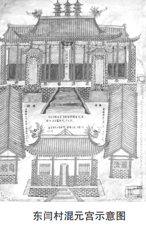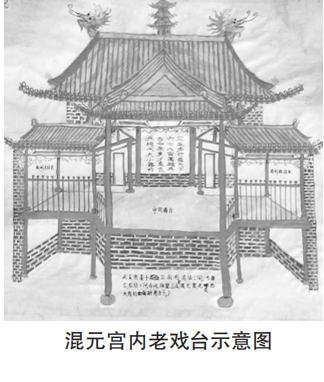 在東同村因有老君傳道之說,老君與混元宮內(nèi)老戲臺示意圖 混元天尊又同為道教始祖,于是人們在紀念老君的同時又建了這座混元宮,使兩位道教始祖的神靈同駐村中,寄托著人們對道法的尊崇和對神道的敬仰之情。