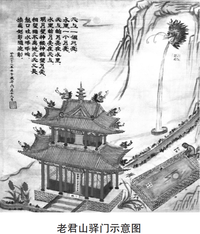他從老君坡緩步而上,見這里山環(huán)水繞,風景秀麗,心情十分愉悅??斓缴巾敃r,眼前出現(xiàn)了一座閣樓式的大山門,有道士將他迎入閣樓內(nèi)落坐。吃過茶后,他要道士引他去朝拜太上老君,道士說:“要拜老君,須更衣洗面方能顯示誠意。”獻公隨即脫去戰(zhàn)袍、軍靴,換上素衣麻鞋,道士領(lǐng)他進入山門,在一水池旁站下。道士先抬手指著不遠處的一座土崖說:“主上請看那是什么?"