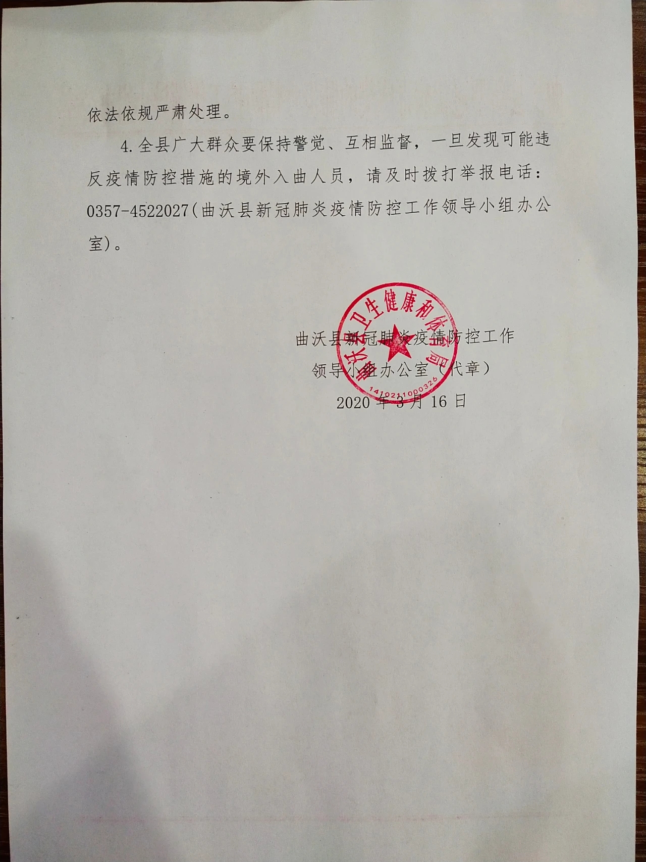 4、全縣廣大群眾要保持警覺、互相監(jiān)督,一旦發(fā)現(xiàn)可能違反疫情防控措施的境外入曲人員,請及時撥打舉報電話:0357—4522027(曲沃縣新冠肺炎疫情防控工作領(lǐng)導(dǎo)小組辦公室)。