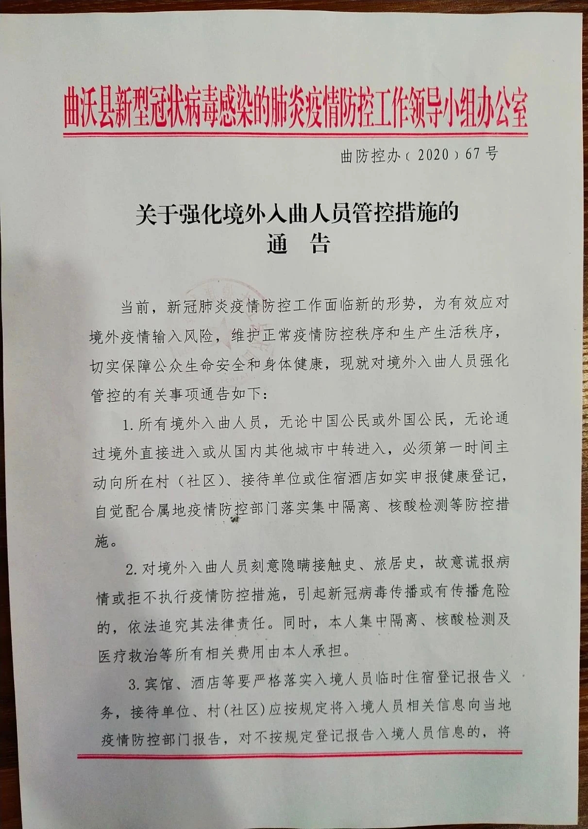 當前,新冠肺炎疫情防控工作面臨新的形勢,為有效應(yīng)對境外疫情輸入風(fēng)險,維護正常疫情防控秩序和生產(chǎn)生活秩序,切實保障公眾生命安全和身體健康,現(xiàn)就對境外入曲人員加強管控的有關(guān)事項通告如下: