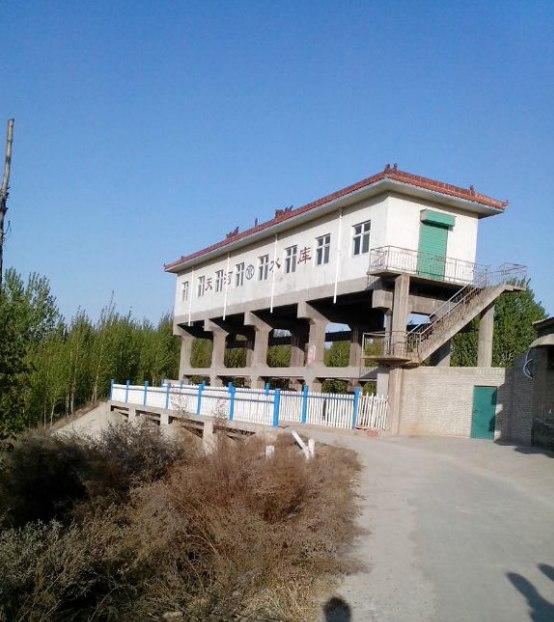 天河水庫興建于1975年。1976年受益。水庫樞紐工程由大壩、灌溉涵洞及溢洪道三項組成。大壩呈南北方向,為均質(zhì)碾壓土壩,大壩迎水坡為干砌石護坡,高程463.5米以上。坡度1∶2.5,背水坡坡度自下而上為1∶2.5、1∶2.0兩級。壩頂寬4米,壩高16.5米,防浪墻高1.2米,壩頂長232米。溢洪道利用天然地形布置于大壩右側(cè)庫岸,泄水入黑河,輸水涵洞位于大機房左岸樁號0+050米處,與壩軸線垂直相交,選用Φ580鋼筋混凝土管兩道,全長56米,縱坡1/100,出口設ф600閘閥門兩個,下游與輸水渠相接,設計灌溉面積1萬畝。